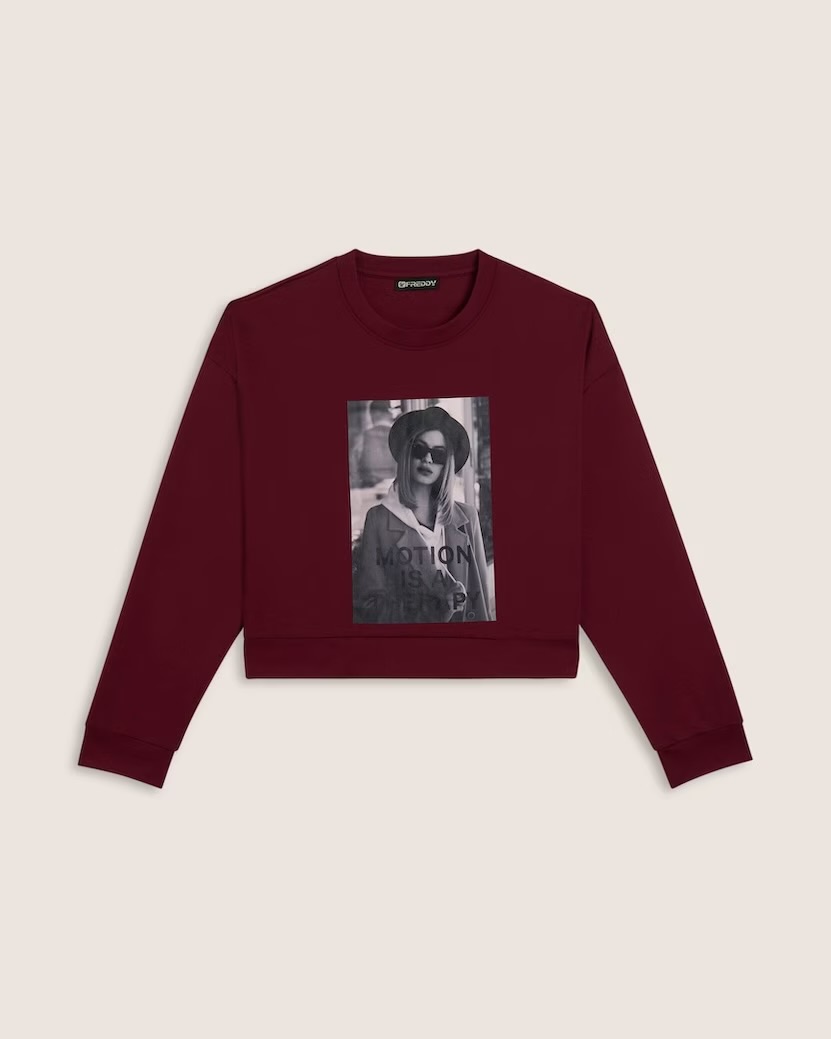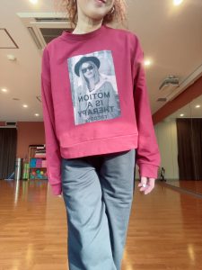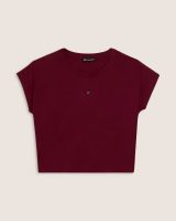 トップスはボルドーのTシャツで人気だったブラックハットの女の子のプリント❗️丈は短め❗️普段に着る場合は重ね着も良いかと🙆